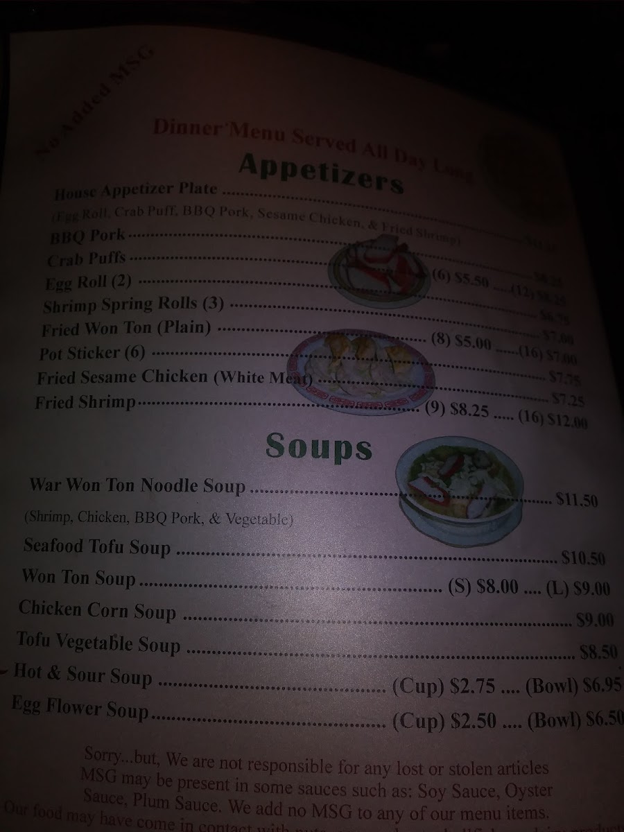 Favorites like Mongolian Beef, Kung Pao Chicken, and the Lucky Sweet & Sour Combo provide satisfying options whether you're stopping by for a casual lunch or a laid-back dinner. Steaming bowls of Hot & Sour Soup or Egg Flower Soup complement these meals, making them a cozy choice for cooler days or quiet get-togethers.
